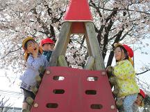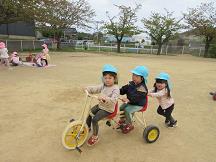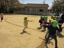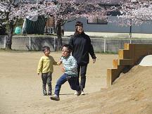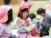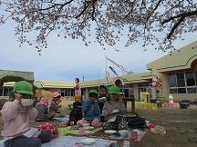 お外で給食を食べたり・・・。 (今日は桜の木の下で給食です) リレーをして楽しんでいます! |