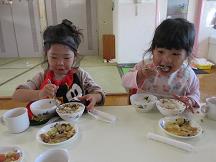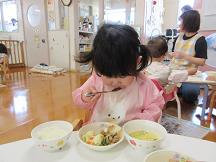 | 元気に遊んだ後は・・・ もりもり沢山ご飯を食べてます! 「せんせー、おかわりくーださい!」 |