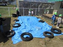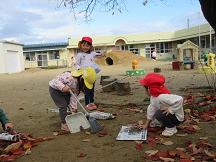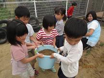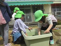 | 「美味しいお米にな〜れ」 まずはバケツで田んぼ作りです! |