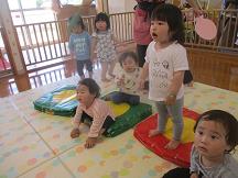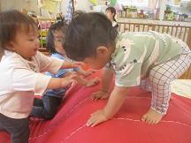 自分より小さいお友達をポンポンポン! 先生のまねっこかなぁ?(1歳児) |