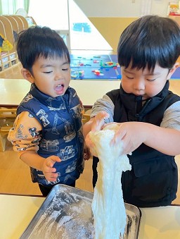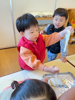 お餅つきではお餅が出来る工程を近くで見たり、触らせてもらいました。杵の動きに合わせて「よいしょーっ!よいしょーーっ!!」と全力で応援しながら「ご飯のにおいするな」「すごいなぁ」と友達とおしゃべりしながら、お餅つきの雰囲気を楽しんでいました。