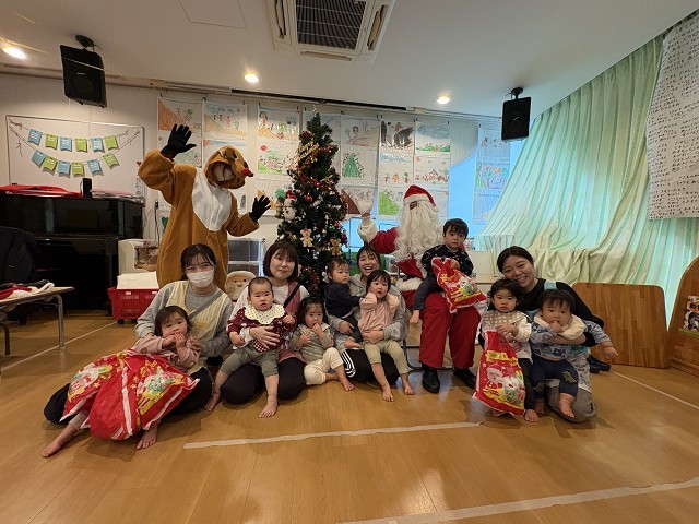 クリスマス会では待ち侘びていたはずのサンタさんが目の前に登場すると、なんだか顔を引きつらせて半泣きな子が居たり、緊張気味なりす組さん。。。 どれだけ緊張していても、いざプレゼントを渡されるとしっかり受け取る逞しい子どもたちでした!笑 クリスマス会が終わると「サンタさん怖くなかった!」と強気発言!! ほんまかいなぁとツッコミたくなるワンシーンでした笑