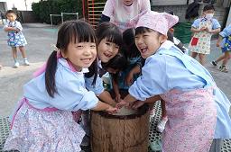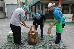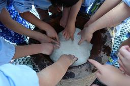 | 臼と杵でもちつき♪ なかなか体験 できないことですね。 みんなで一緒にすると、 特別感があって楽しいね♪ |
