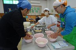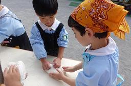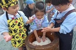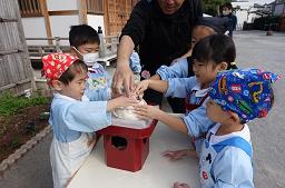 | 年長組は、つきたてのおもちで『鏡餅』を作りました。 もちもち、ぺたぺた! 手にくっついて、ちょっぴり難しい…。 でも、みんなで力を合わせて頑張りました。 |