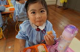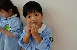 | 蒸したてのもち米とつきたてのおもちを みんなでいただきまーす! 今年は、きなこもちを食べたよ。 よく噛んで、もぐもぐ…。「おいしい♪」「おかわりー!」 |