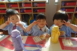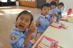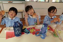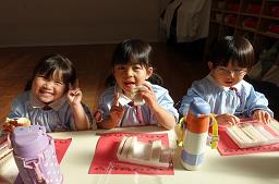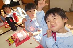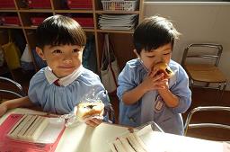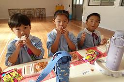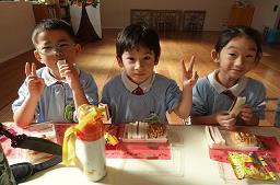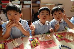 | この日の給食は、スペシャルメニュー! サンドイッチやチョコパン、ビスケットです。 とびきり嬉しいごちそうに、にっこり笑顔の子どもたち♪ |