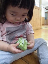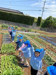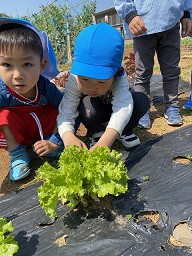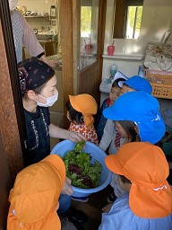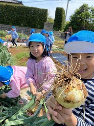 | みんなで植えた玉ねぎとサニーレタス、そら豆が収穫できました。カレーやおやつでいっぱい食べようね。 |