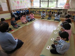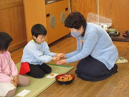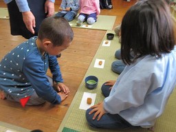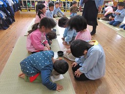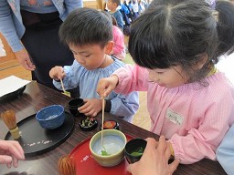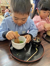 | 年長さんになったら 憧れの茶道教室。 この時ばかりはきちんと正座。かっこいいでしょ? |