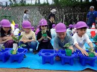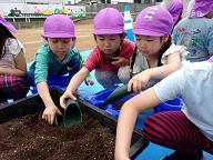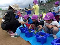| 一人ひとり鉢に土を入れて、大切に植えたよ とっても上手にできたね☆ |