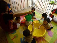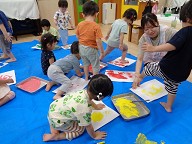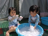 | 感触遊び 夏は、思う存分に感触遊びを楽しめる季節。 見て、触れて、五感をたくさん使って、様々な遊びを思いっきり楽しみました。 |