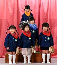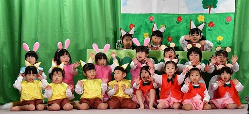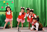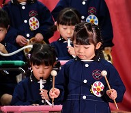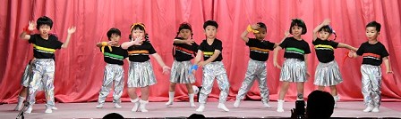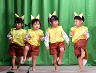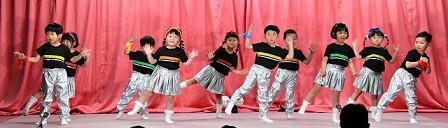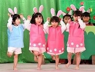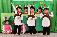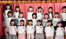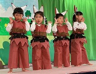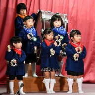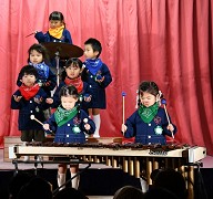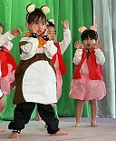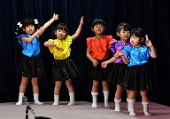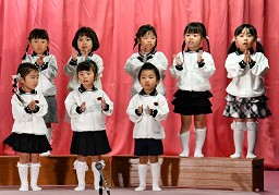 | 歌 ・ 合奏 ・ リズム かわいい・かっこいい衣装に身を包み、はりきってリズムを踊ったり 合奏では、つきぐみ全員が息を合わせて演奏しました。 |
