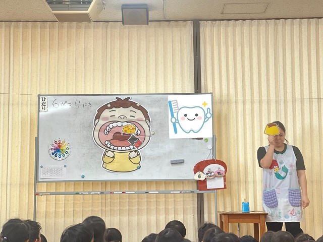 | 27日(木)に食育集会があり、6月4日の虫歯予防デーにちなんで 歯磨きの大切さや、どのようにして虫歯ができるのかを学びました。 大きな口を開けて「虫歯ないよ!」と見せ合う子どもたちが とても可愛らしかったです |