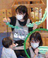 こちらでは、 『だれのおしりかな?』という パネルシアタークイズをしました。 次々に出てくる動物のおしりの絵を見て、 「うさぎさん」「ぱんださん」と 元気に答えていました。 くるっと回して答えの動物が出てくると 大盛り上がりでした。 |