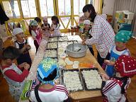 | 1/12 じゃがいものおやき作り(年長児) 給食室で茹であがったじゃがいもの 皮をむいてから、片栗粉を入れて、 つぶしました。次に丸めてバットに 順序よく 並べて行きました。 星やハートの形を考える子がいて、 楽しく出来ました(*^。^*) |