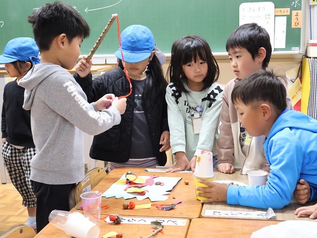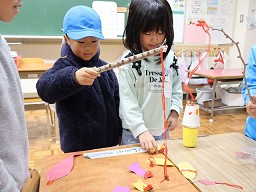 | 11/26(水) 貫小学校交流会(年長児) 貫小学校の1年生と交流会を行いました。 先日の交流会で拾ったどんぐり等の木の実を使って、一年生が作ってくれた玩具で一緒に遊びました。 マラカス、迷路、けん玉、的あて、魚釣り等々、素敵な玩具がいっぱいあり、子どもたちは楽しそうに遊んでいました。 1ち年生の皆さん、一緒に遊んでくれてありがとうございました。 |