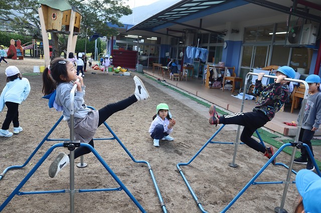 | 素敵な子どもの話し 『“面白そう”を遊びに』 子どもたちはとにかく楽しいことが大好きです。 特に体を使うことが好きです。 なので、今私たち保育士は、職員研修で子どもの遊びの幅を広げようと試行錯誤中です。 私は中村先生、宮原先生と3人で“ぶらさがる遊び”を考えています。 ただぶら下がるだけでは面白くない! なので、ぶら下がって足じゃんけんを考えました。 ところが・・・ 足じゃんけん自体ができない子どもが続出。 と言う訳で、まずは足じゃんけんからやってみよう! それから面白そうと思った子どもたちは、やってみたーいと鉄棒に並び、ぶら下がりじゃんけん大会を始めました。毎日のように開催中です。 |