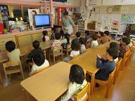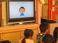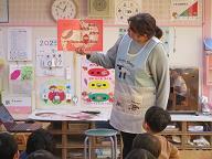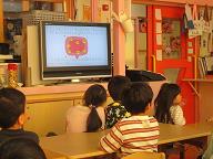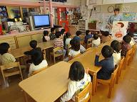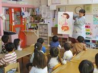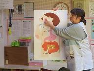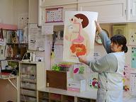 スライド学習の締めくくりには、「おなかのこびと」の絵本を読み聞かせしました。この絵本は、子どもたちが楽しみながら、食べたものが体の中でどうなるのかを復習するのにぴったりの内容でした。 |