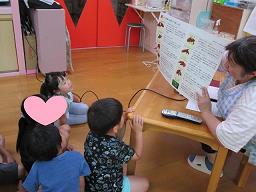 「さつまいもは木で育つ?土で育つ?」「さつまいもは秋に掘る?春に掘る?」など簡単なクイズ形式で学び、さつまいもの栄養素・さつまいもの種類もフリップを使って学びました。 9月に掘ったさつまいもを使ってクッキングも予定しています。 |
