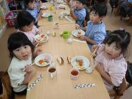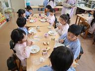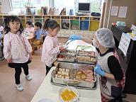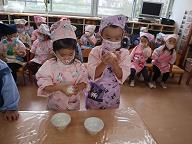 | おにぎりくっきんぐ・おでんバイキング おにぎりクッキングは以上児さんを対象に行いました。ひまわり組は初挑戦で苦戦する子もいましたが自分で握ることができた喜びを感じ、美味しくいただきました。きく組、さくら組は慣れた手つきで具材を入れたり、のりで巻いたりして楽しみながらおにぎりを握りました。 おでんバイキングでは、先生に自分の食べたい具材を伝えて一人ずつついでもらいました。何度もおかわりをして満足そうでした。すみれ組・たんぽぽ組は個食盛りでおでんを楽しみました。 |