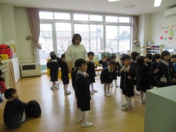 始業式に当たって 『園長先生からいろんな人がいて 良い・・お友達の良いところを見つけてあげましょう。』という お話をしたいただき 園児たちは、皆、真剣にお話を聞いていました。
