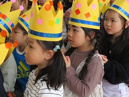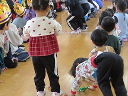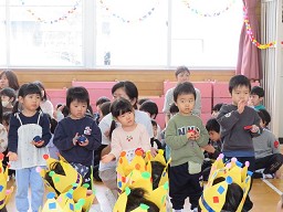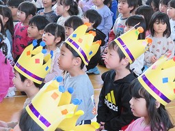 その後 年長さんの卒園製作披露、引継ぎ活動、 そして 年長さんの歌のお礼、フォークダンス 最後に年中少さんのくす玉がパかッと割れて 「そつえん おめでとう!」で 締めくくりました。