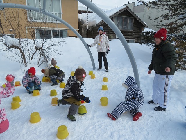 「的あて」「宝さがし」「山登り」「そり滑り」「サッカー」のステーションがあり皆 好きなステーションで 遊んでメダルを もらい雪遊びを楽しんでいました。