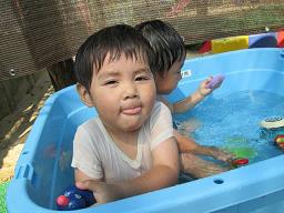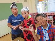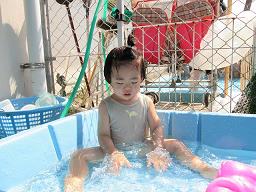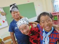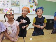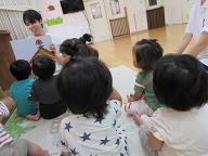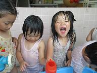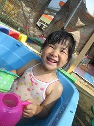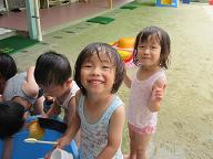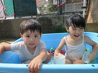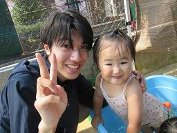 | 職場体験に来たおにいちゃんと一緒に“ハイポーズ” 絵本を読んでもらったり、水遊びを楽しんだりと楽しい時間を過ごしました! |