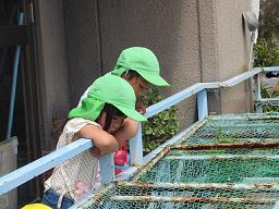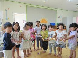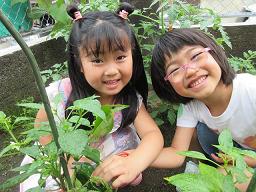 年長さんは夏野菜のピーマンの収穫を楽しみましたよ。 みんなで給食の時に美味しく食べました♪ |