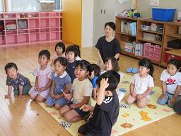 今月は歯科衛生士さんに指導をしてもらいながら歯磨きの練習をしました。 年長さんは染め出しをしてもらい磨き残しの確認もして、ピンクになった口を不思議そうに見ていました。 |