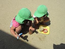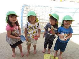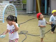 暑い日には水遊びも楽しみました。顔に水がかかることが苦手な子もいますが、ほとんどの子はすぐに水のところへ・・・。 保護者の方はお洗濯が大変かと思いますが、子ども達は大喜びで遊んでいます! |
