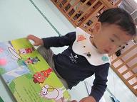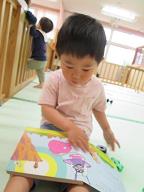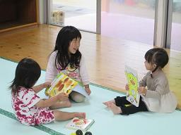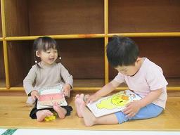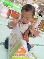 いちご組さんは、お友達と一緒に絵本を見たり 保育士役になりきってお友達に読んであげる姿も見られていますよ。 |