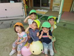 今月の一枚! 異年齢児同士でもよく遊んでいますよ♪ チョウチョウの遊具に座って ハイポーズ!! |