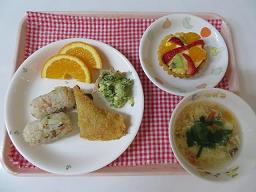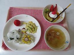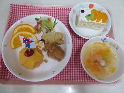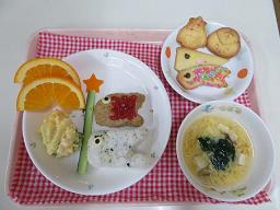 | 5月は子どもの日にちなんでこいのぼり尽くしのメニューにしてみました。こいのぼりハンバーグは子ども達に大人気のメニューです!! 誕生会のメニューは年長児の誕生者が「お子様ランチがいい」と言っていたのでお子様ランチ風にしてみました。とても喜んでいました♪オムライスの上には今年開催されている大阪万博のキャラクター「ミャクミャク」を旗にしてみましたが、子ども達は「しらな〜い」「これなんていうの?」言っていた子ども達でした(笑) |