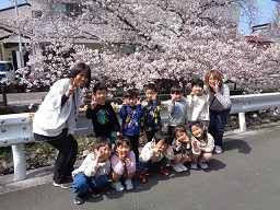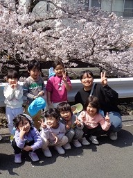 桜を見に、辰野川へお散歩♪「わ〜、綺麗〜!」「いっぱい咲いてるね!」などたくさんお話をしながら、お花見を楽しみました。