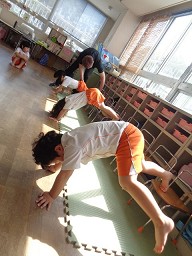 体を動かすことが大好きな子どもたち!体操教室では、くま歩き、カエルの逆立ち、馬跳びなどを教えてもらい、「できるよー!」と言いながら繰り返し挑戦しています。これから1年間をかけて体力をつけ、楽しみながら運動をしていきます。