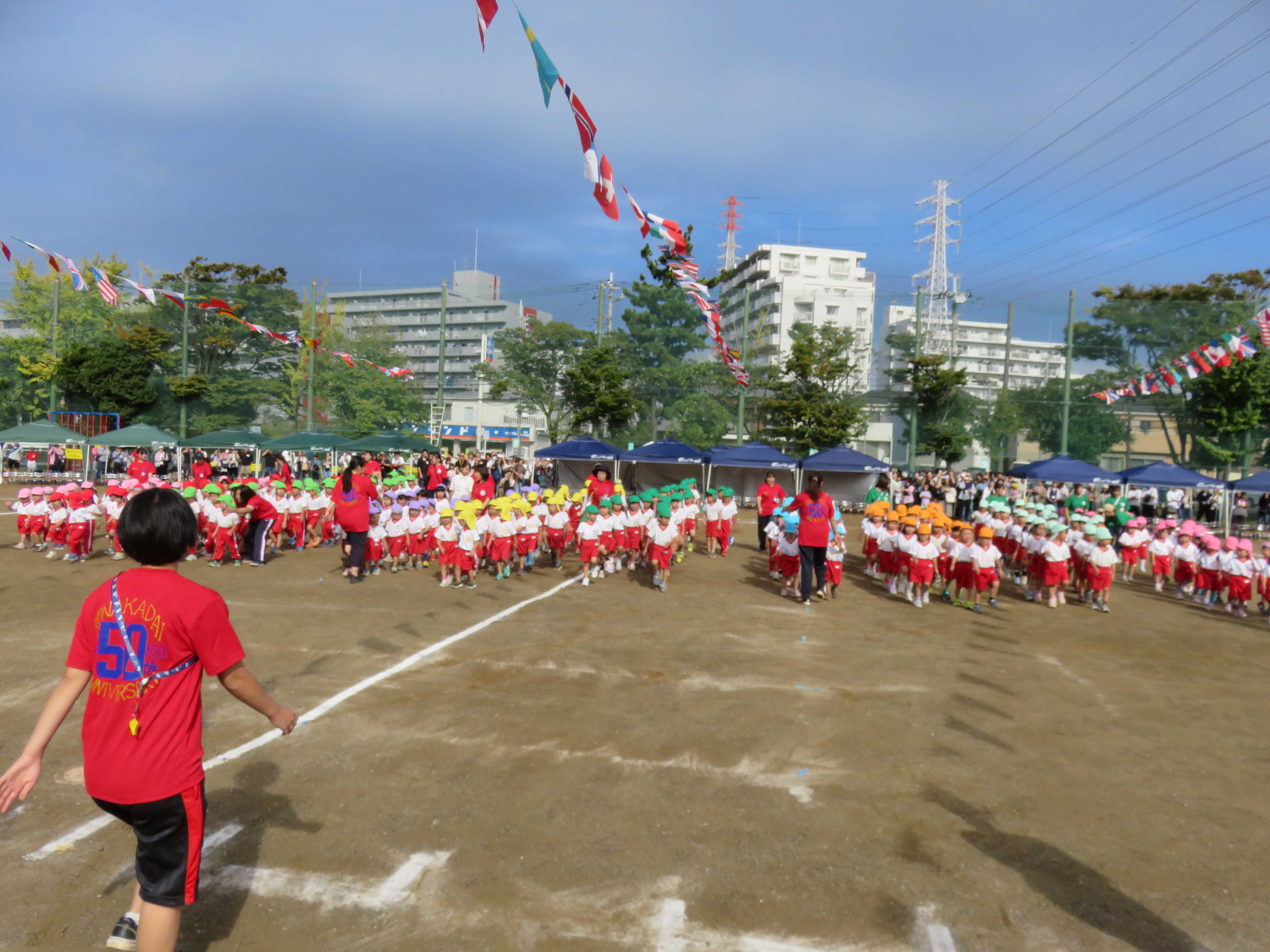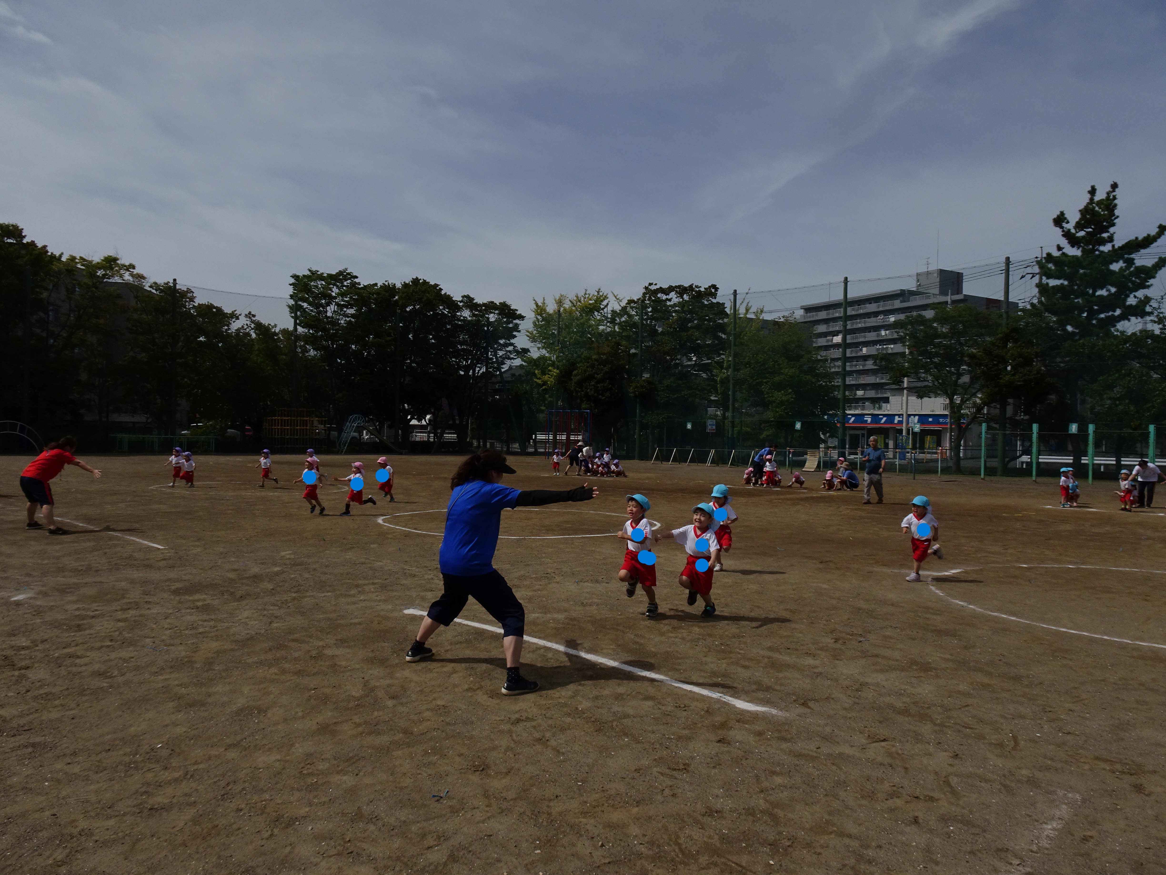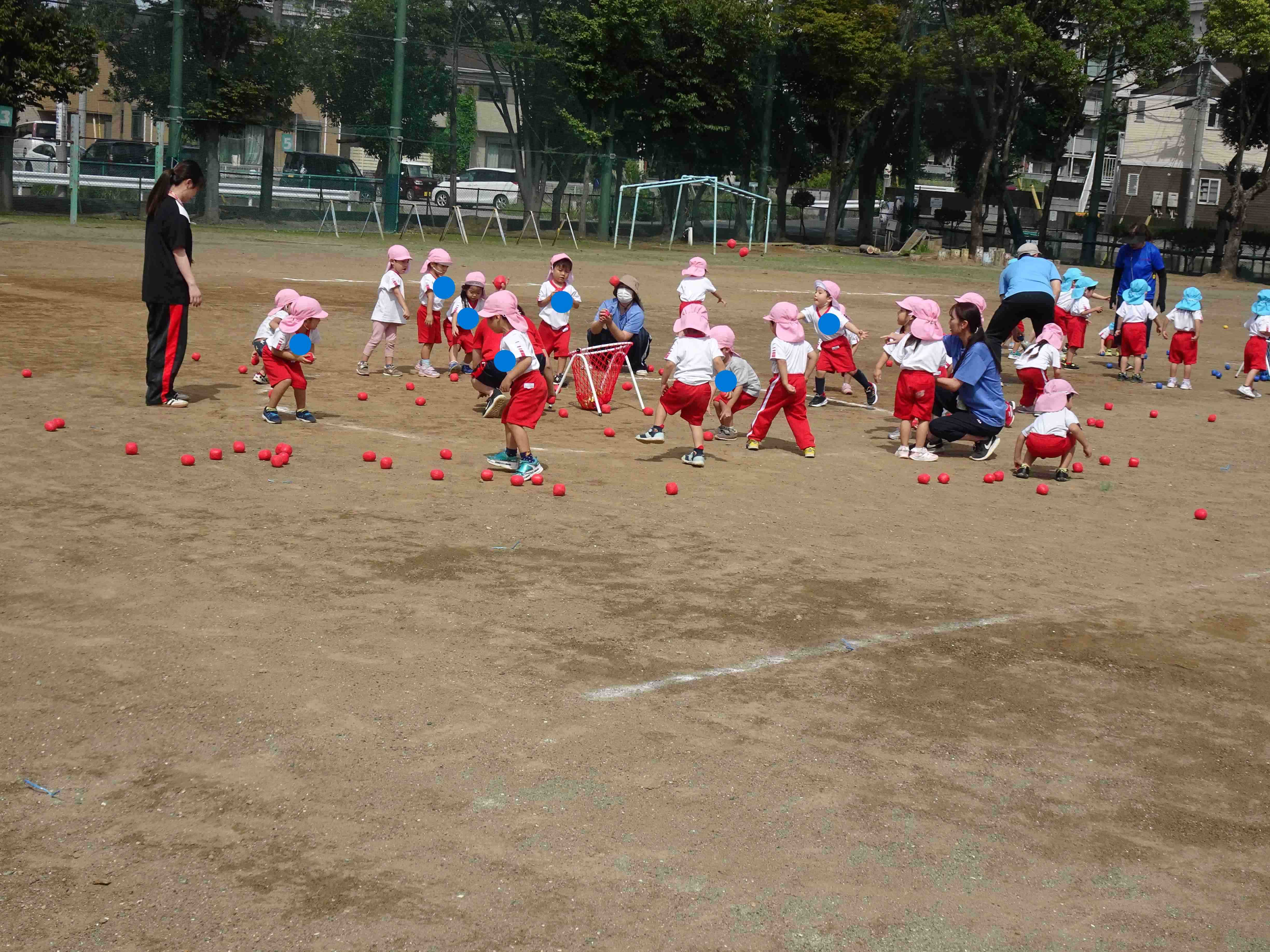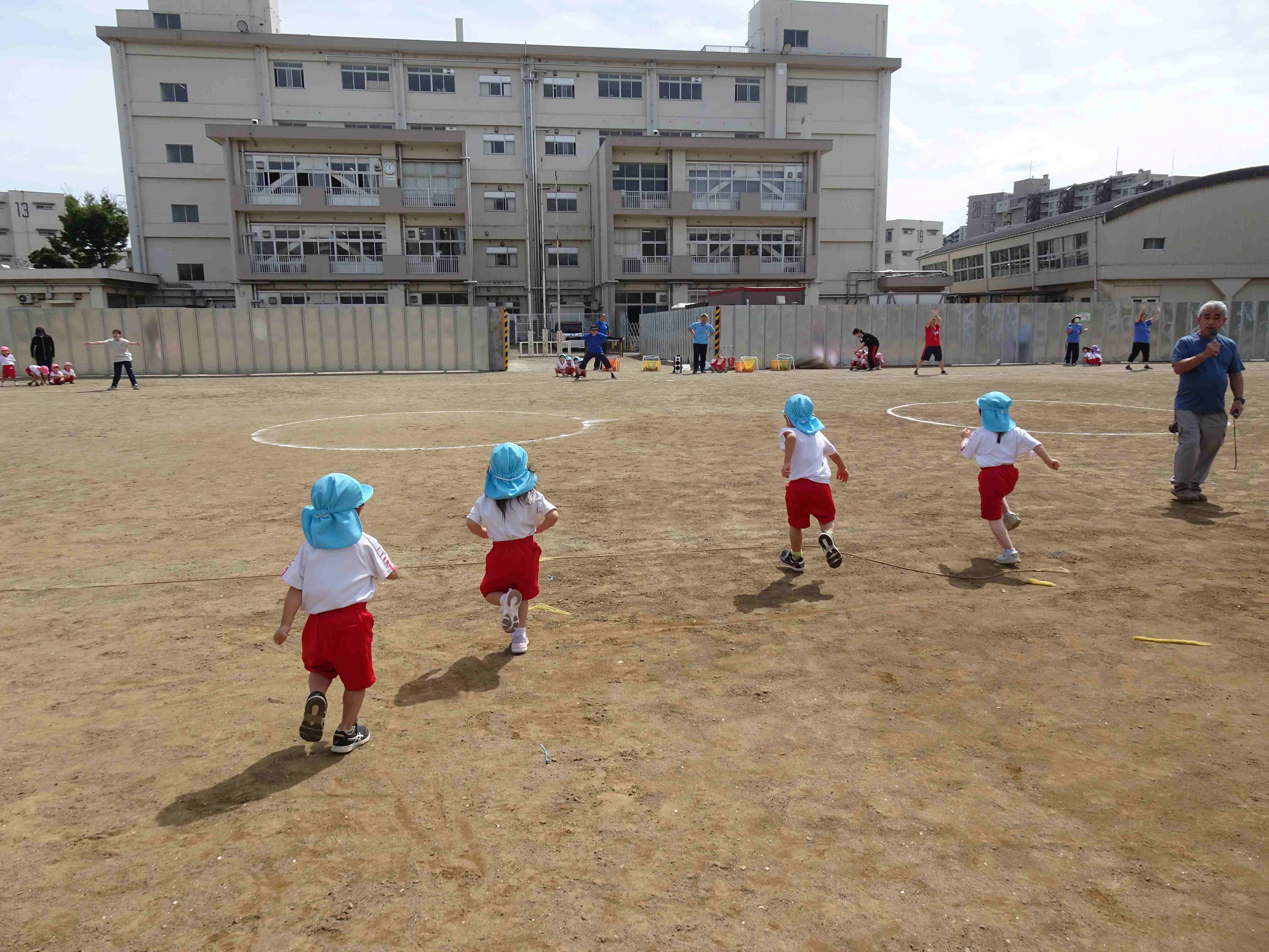 運動会に向けて小中台南小学校の校庭での運動会遊びを始めました。年少組は初めてですので、園庭よりも広い校庭に解放感を感じて大喜び!かけっこと玉入れをして、校庭巡りもしました。
