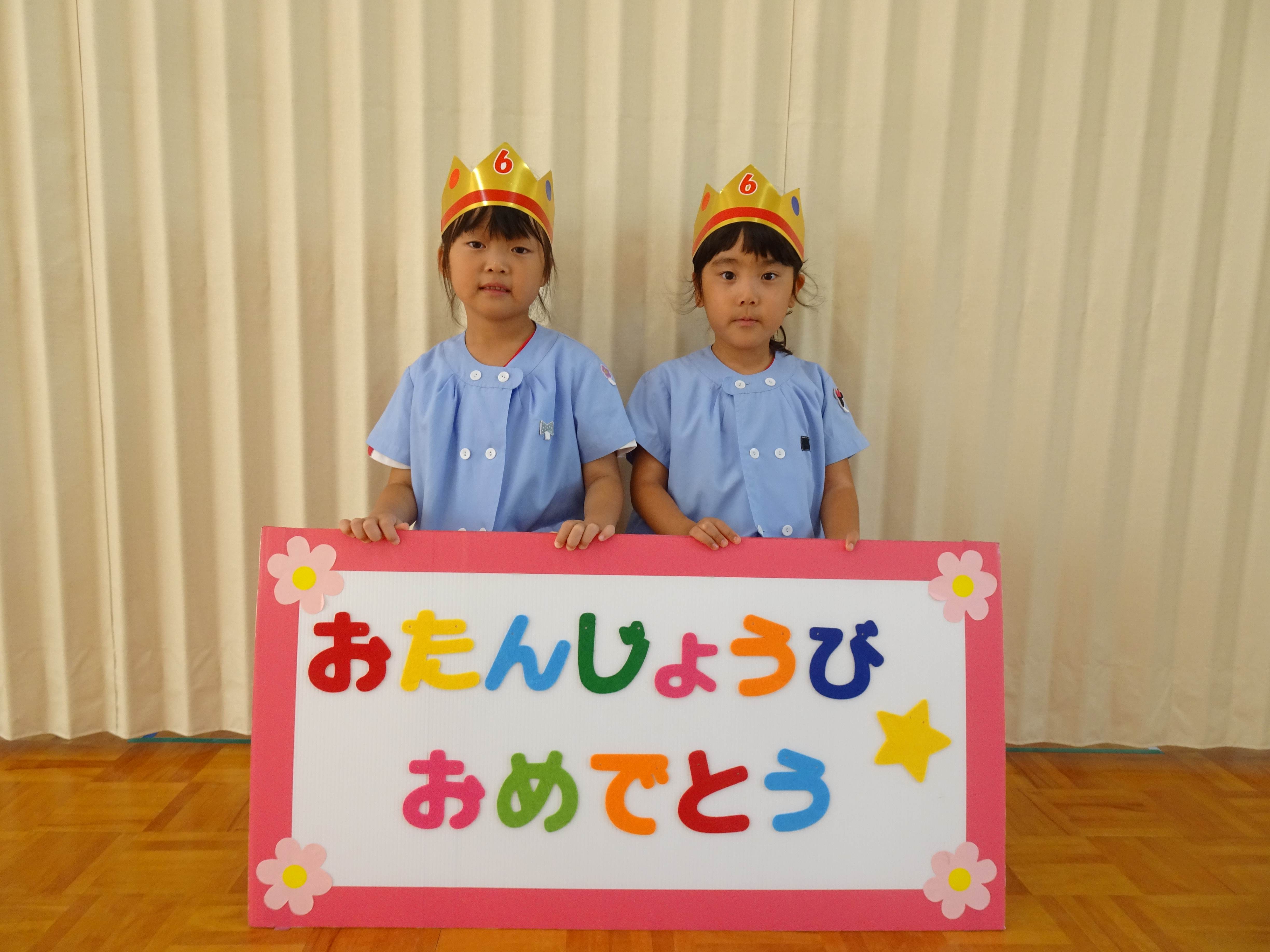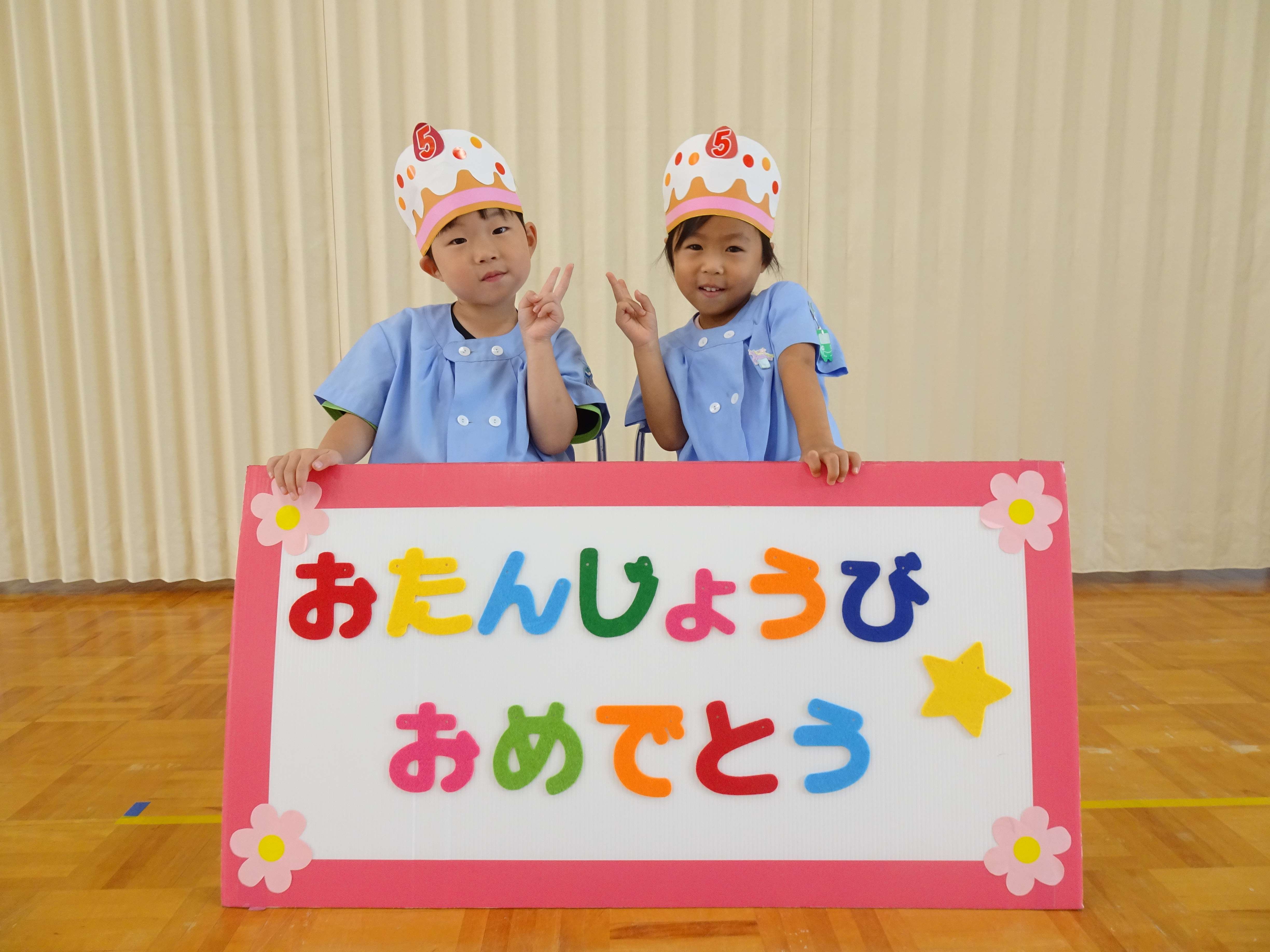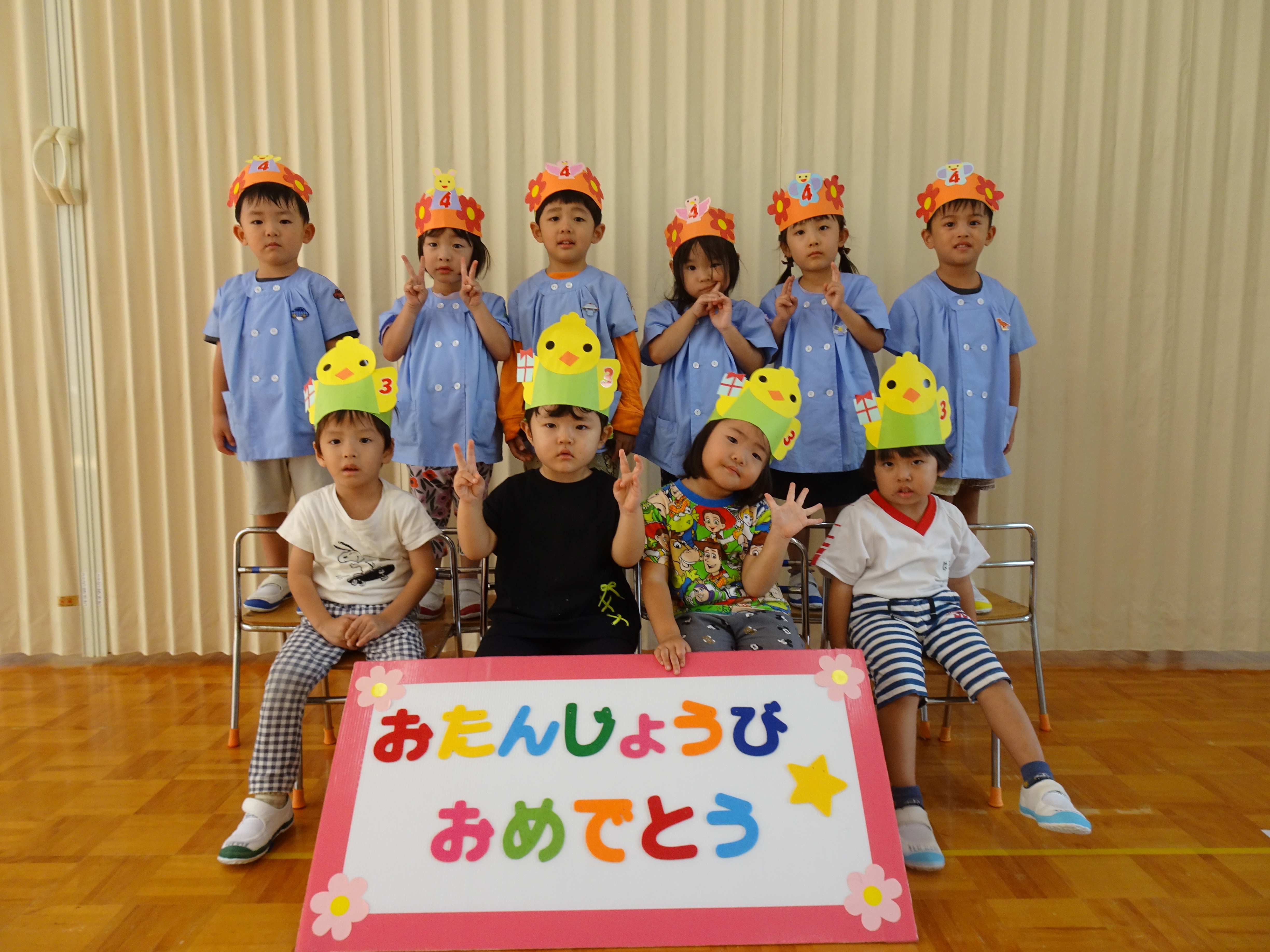 月に一度のお誕生日会…満3歳児クラスのひよこ組は4人全員のお祝いをしました。楽しみにしているおやつは「チョコチップシュガースコ―ン」でした。お友だちに「おめでとう!」と声をかけてインタビューやゲ―ムをして楽しみました。誕生児を学年毎に紹介します。満3クラスの4人と年少組は一緒に撮影しました。