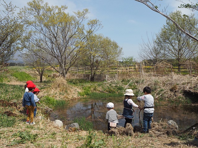 - 園から歩いて2~3分の棚田の中。大きな穴を掘って河から水を引き込みました。そしたらいつの間にか色々な虫や植物が入ってきました。昔の環境にすることで昔ながらの生物が入ってきました。ビオトープには命が一杯あふれている。子ども達は、虫や草花と遊びます。
