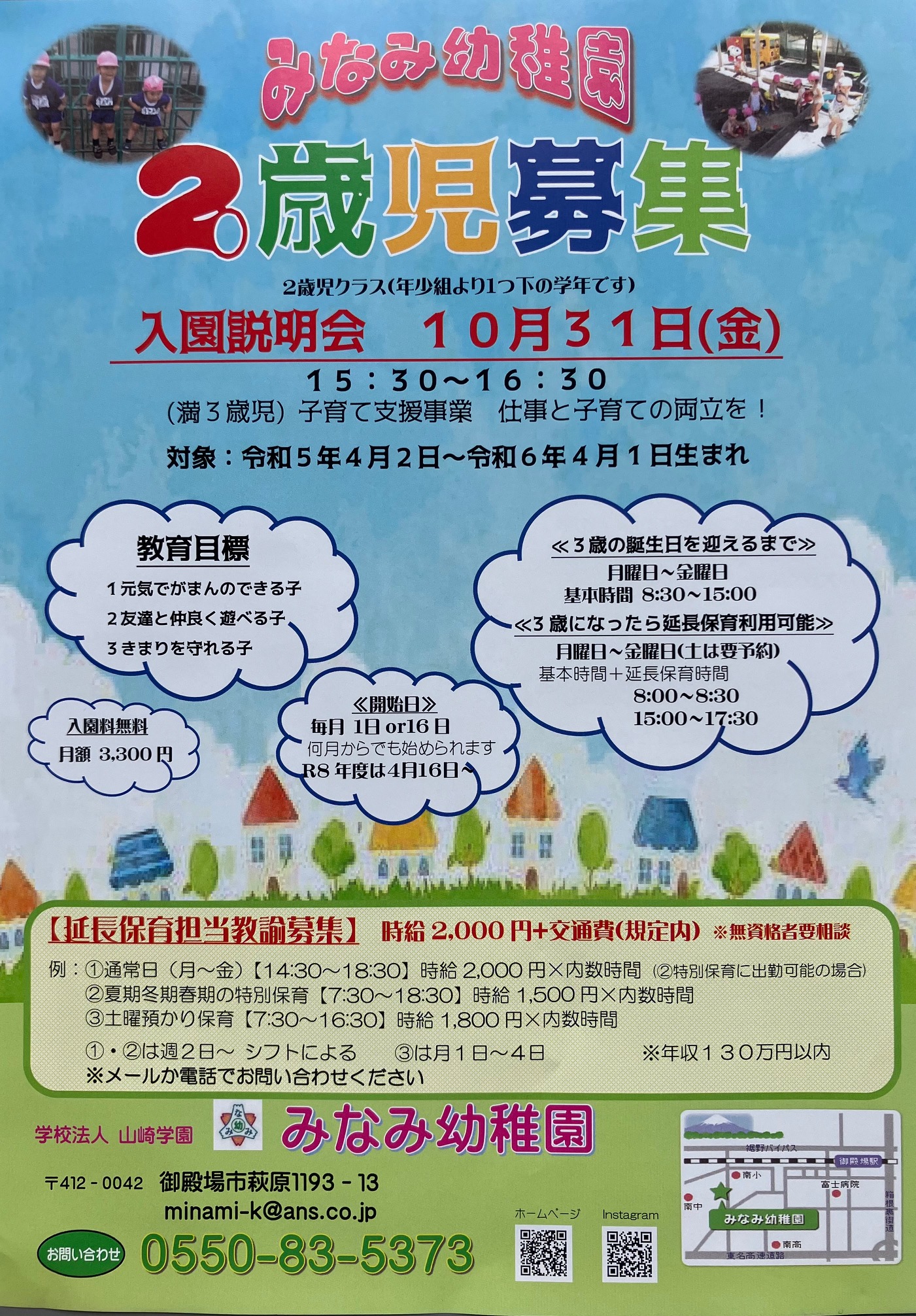 令和8年度、新入園児(2022年4月2日生〜2023年4月1日生)説明会を令和7年8月26日(火)15時00分からみなみ幼稚園ホールにて行いました。入園希望検討されている方は、TELもしくはメールにてお問い合わせください。