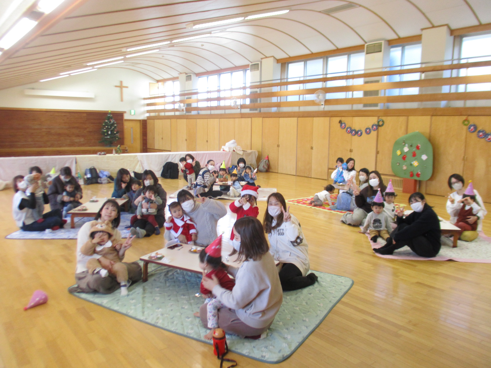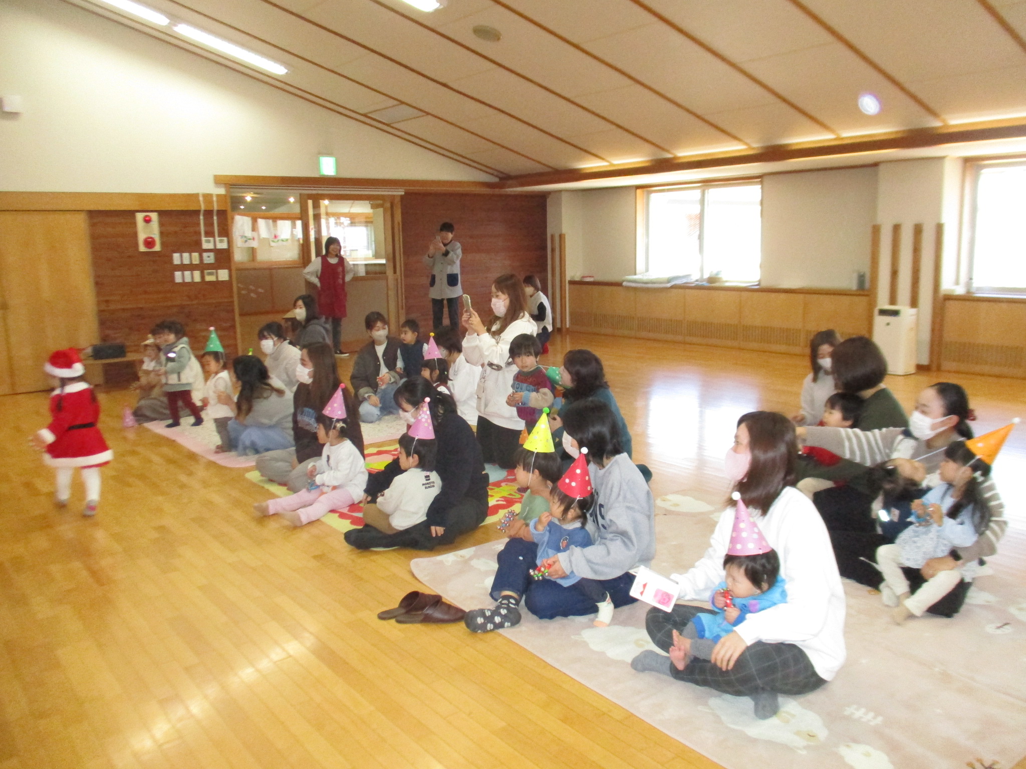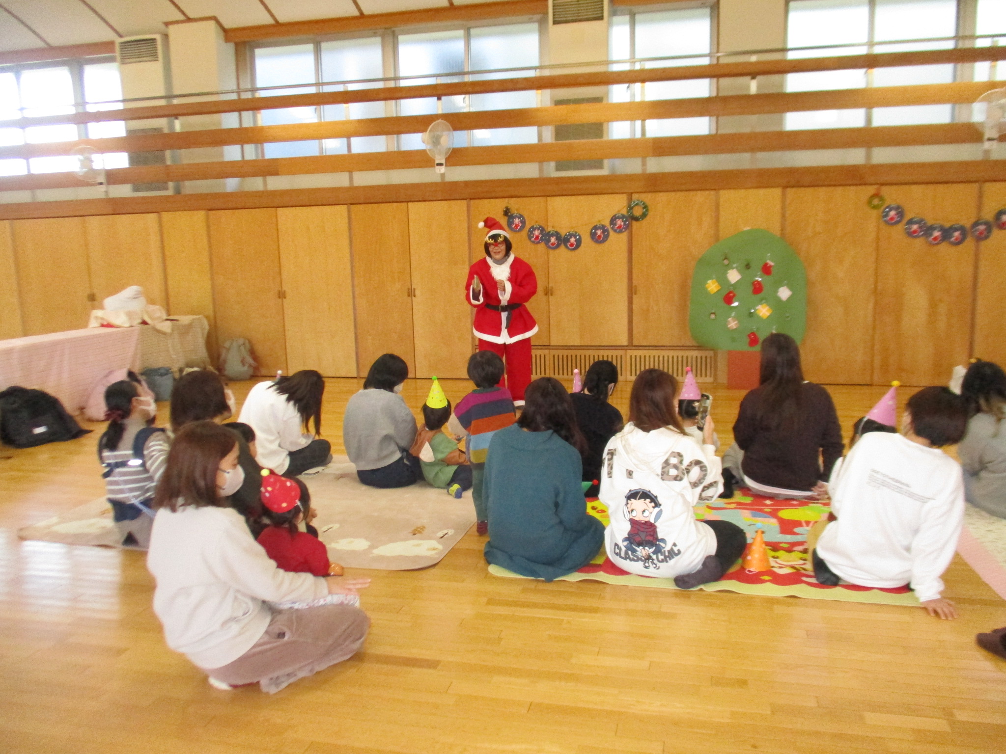 「みんなのひろば」でクリスマス会をしました!みんなで鈴をならして合奏をしているとサンタさんが遊びにきてくれました。その後はおいしいゼリーを食べて、たのしいクリスマス会になりました♪