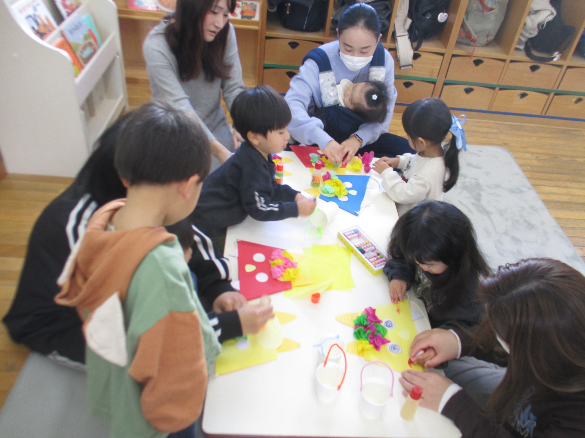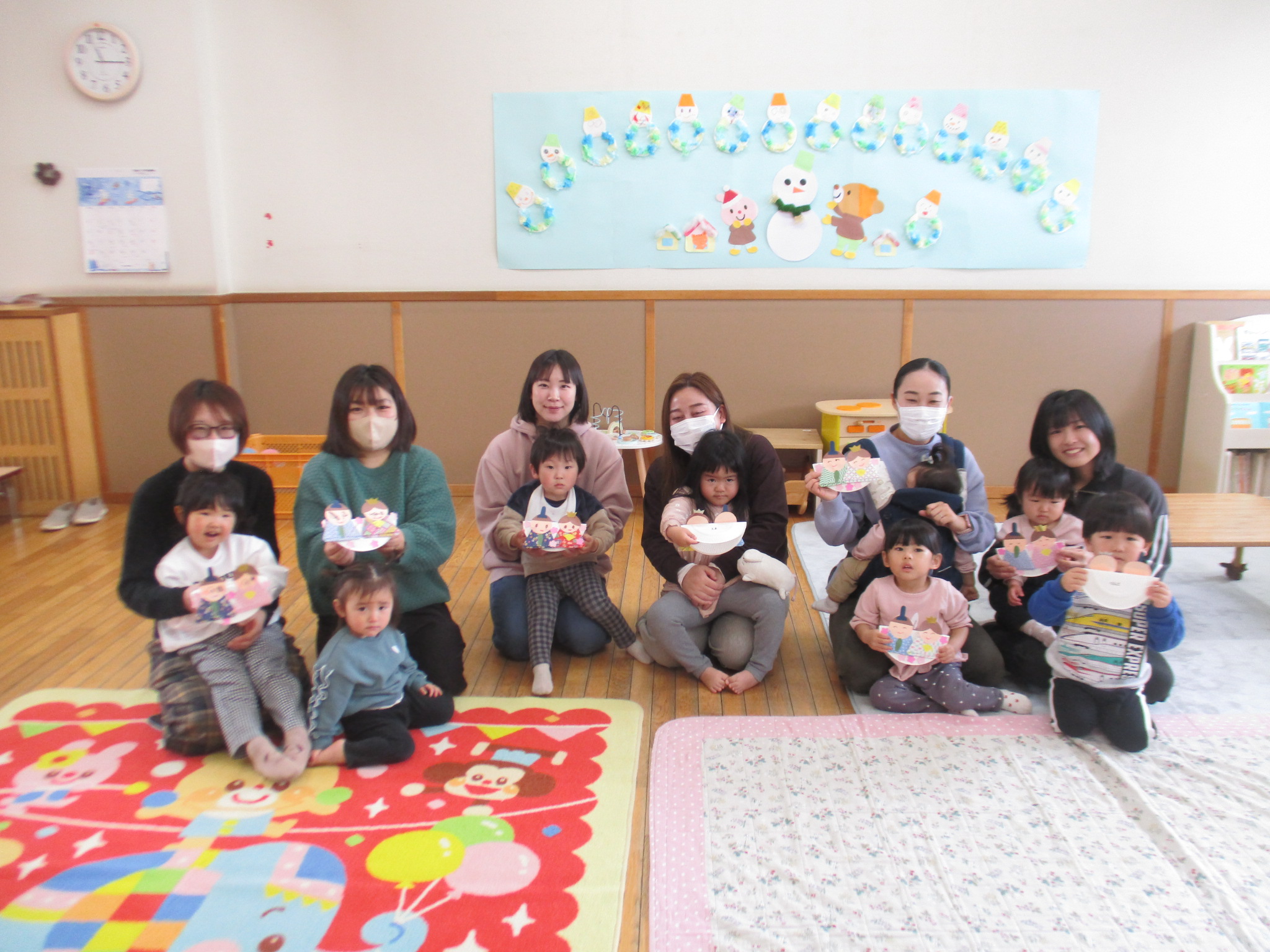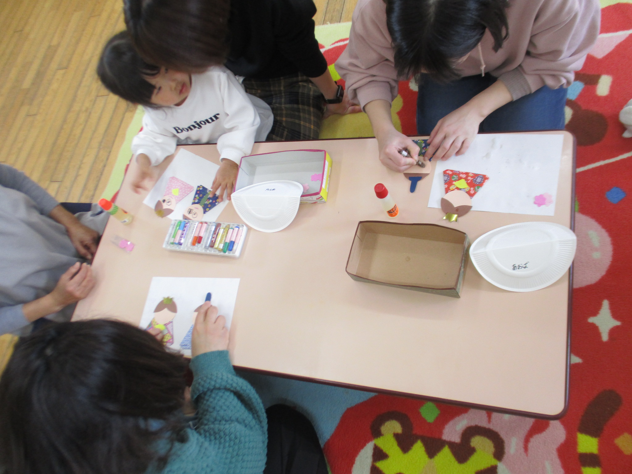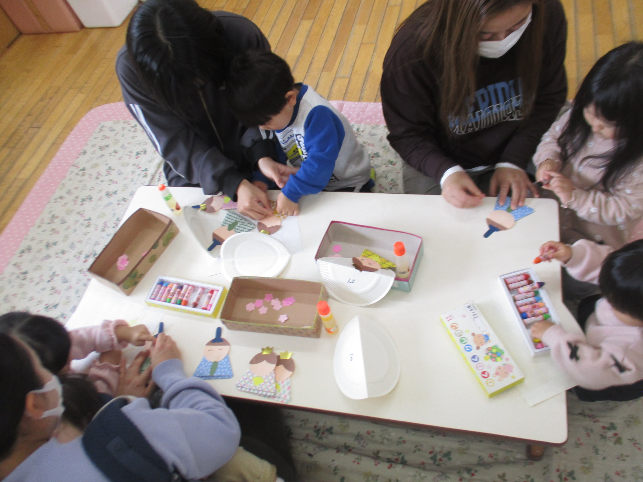 今日はおひなさま作りをしました!おだいりさま・おひなさまのお顔をクレヨンで描いたり、のりでペタペタと貼ってかわいいおひなさまの完成です♪お家に飾ってね!