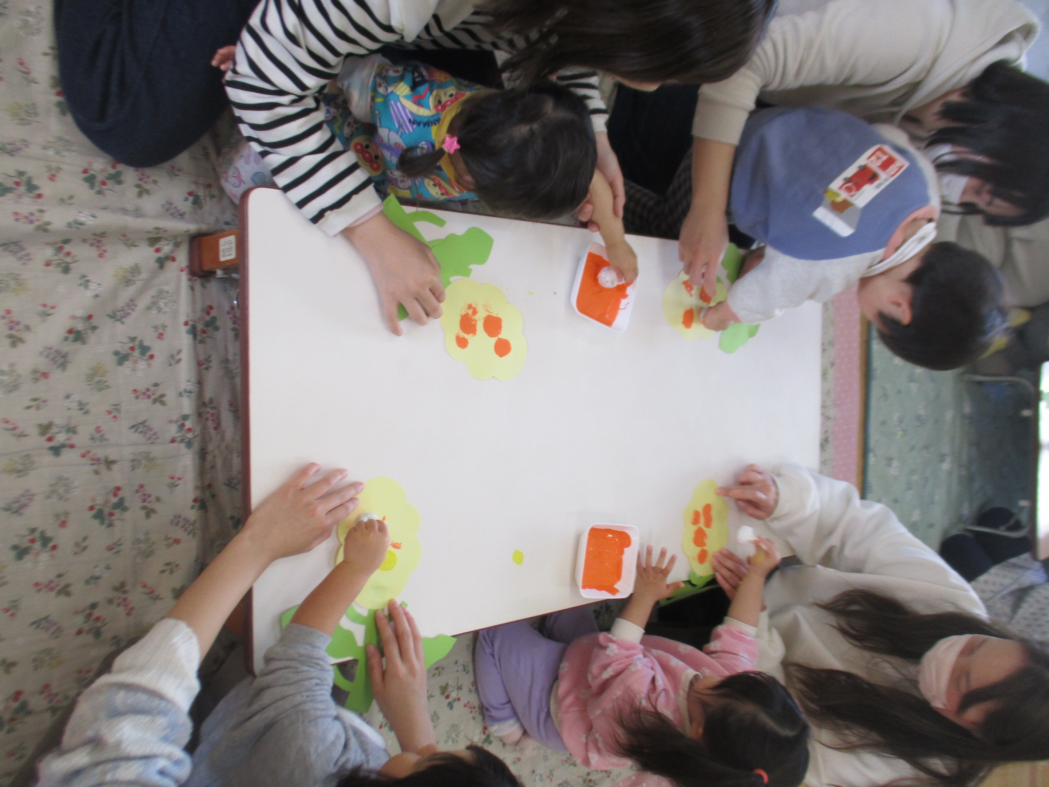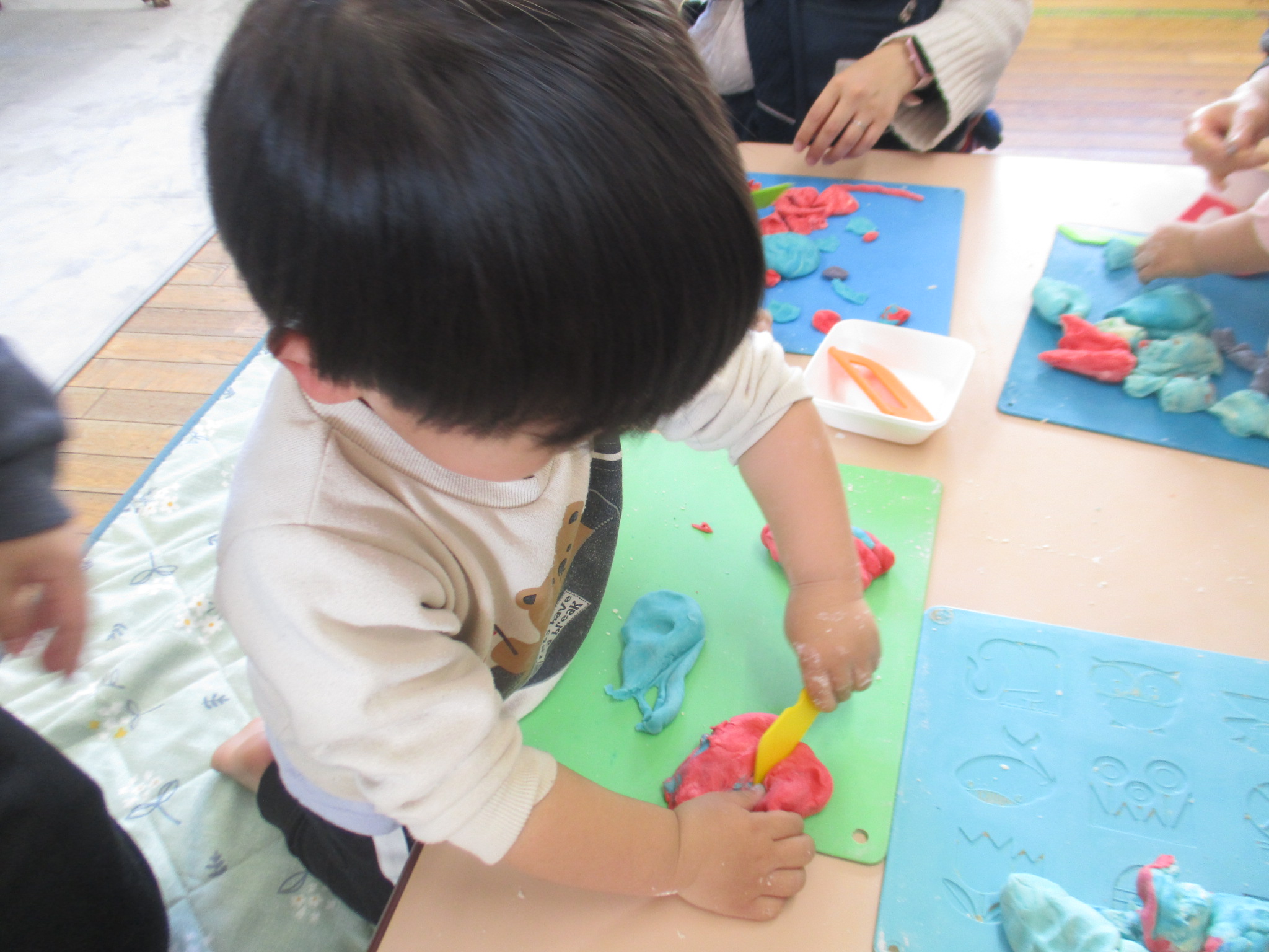 今日は「みんなのひろば」で感触遊びをしました。小麦粉の感触を楽しみ、油をいれて、水を入れてそれぞれの感触の変化に驚きながらもよく触っていました!最後は食紅で色を付けて小麦粉粘土を楽しみました☆