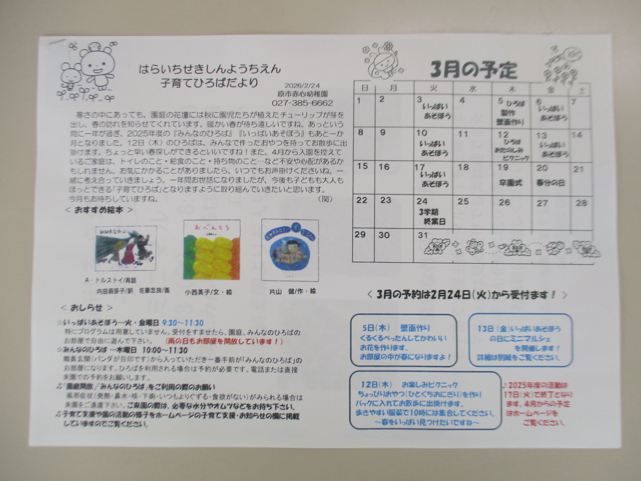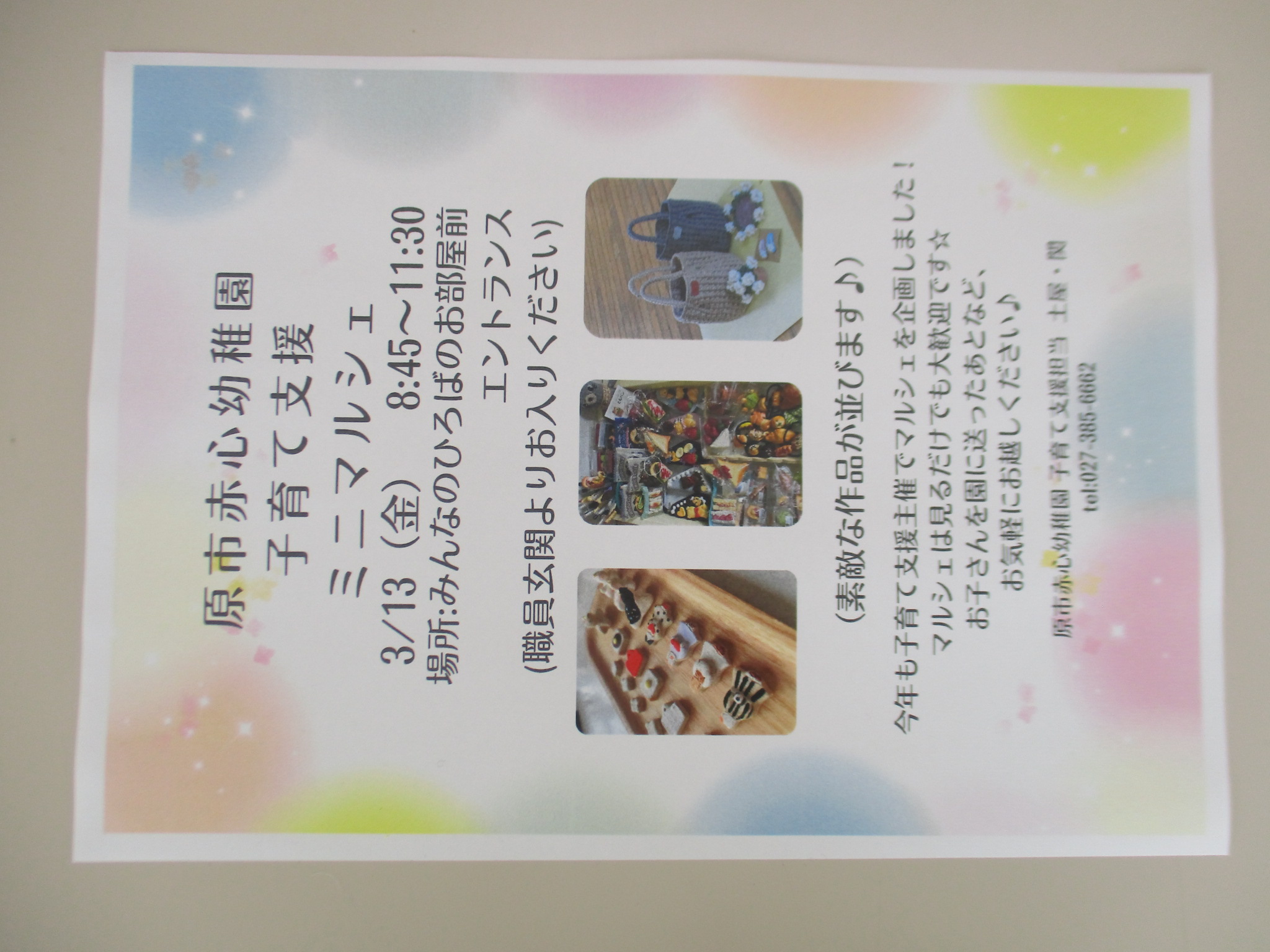 子育て支援の3月の予定表ができました。早いもので今年度最後の1か月となりました。みなさんと楽しい時間を過ごせたら良いなと思っています。気軽にお越しください!!また、3月13日(金)に子育て支援主催でミニマルシェを行います★