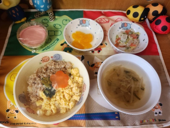 給食で三色丼、おやつに三色のひなまつりゼリーが出て