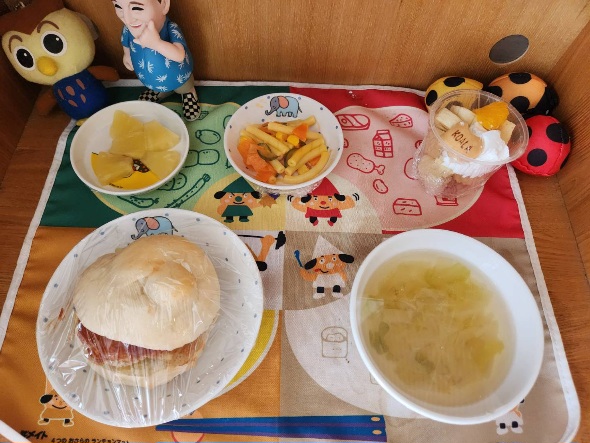 給食は年長さんが大好きなメニューで幼児クラス全員で食べ、おやつは乳児クラスへ年長さんが来てくれて、みんなで楽しみながら食べました♪