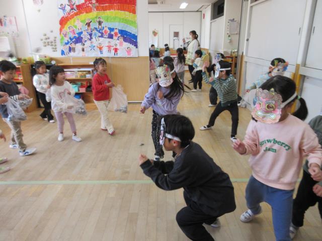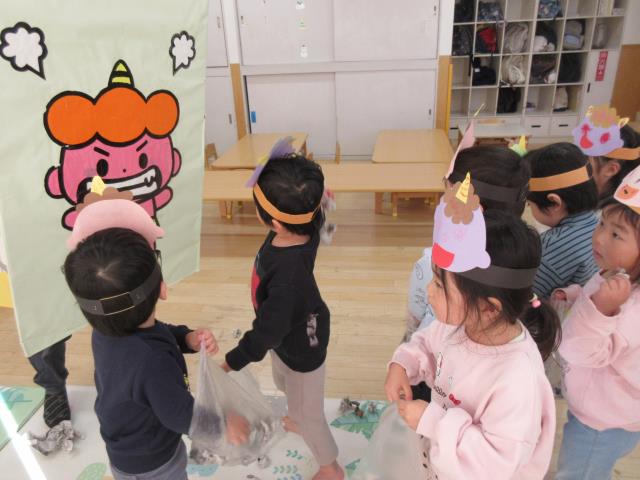 子ども達が作ったお面をかぶり鬼役と新聞紙で作った豆を投げる退治役を交代で楽しみました。