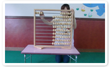 百玉そろばんは、百個の玉という半具体物を使用して、量感をとらえることができる教材で、耳で聞き、目で見て、口で唱えるという3つの器官を使い、緊張感の中で瞬間的に数量をとらえることから、カードと同じ効果があります。