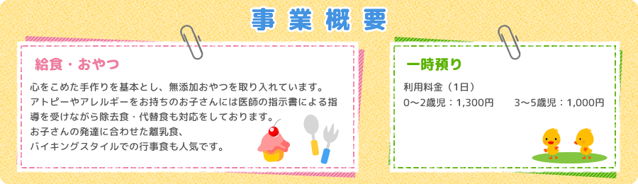 | 開所時間 | 午前7時~午後6時(延長保育午後6時~午後7時) | ||||||||||||||