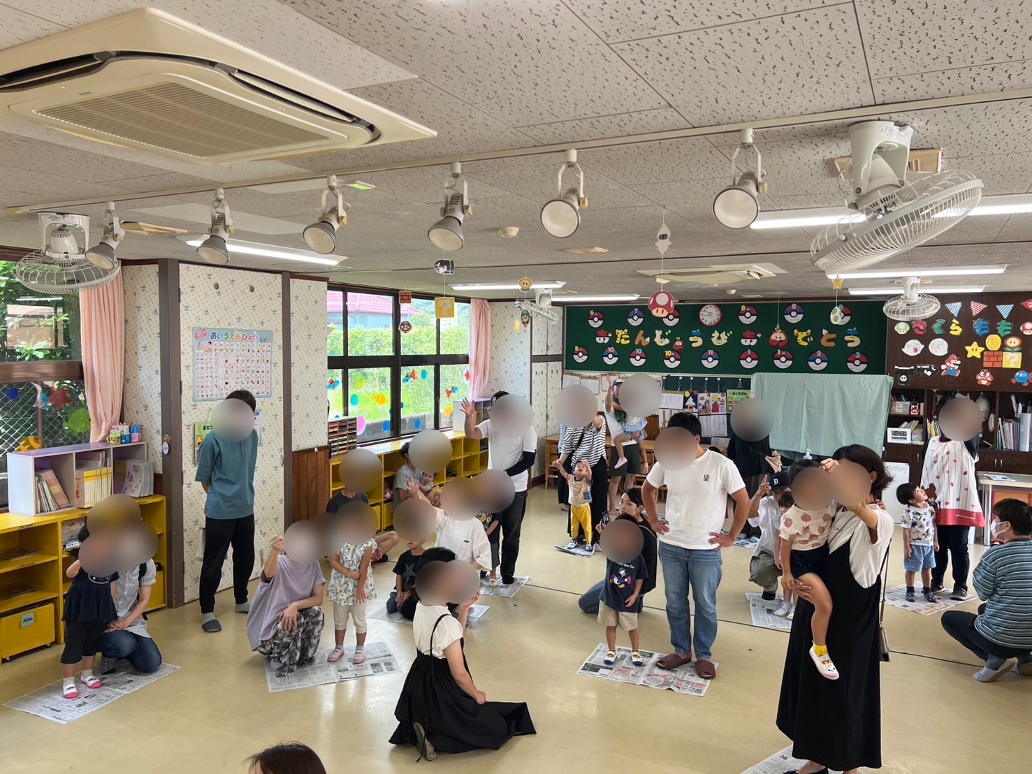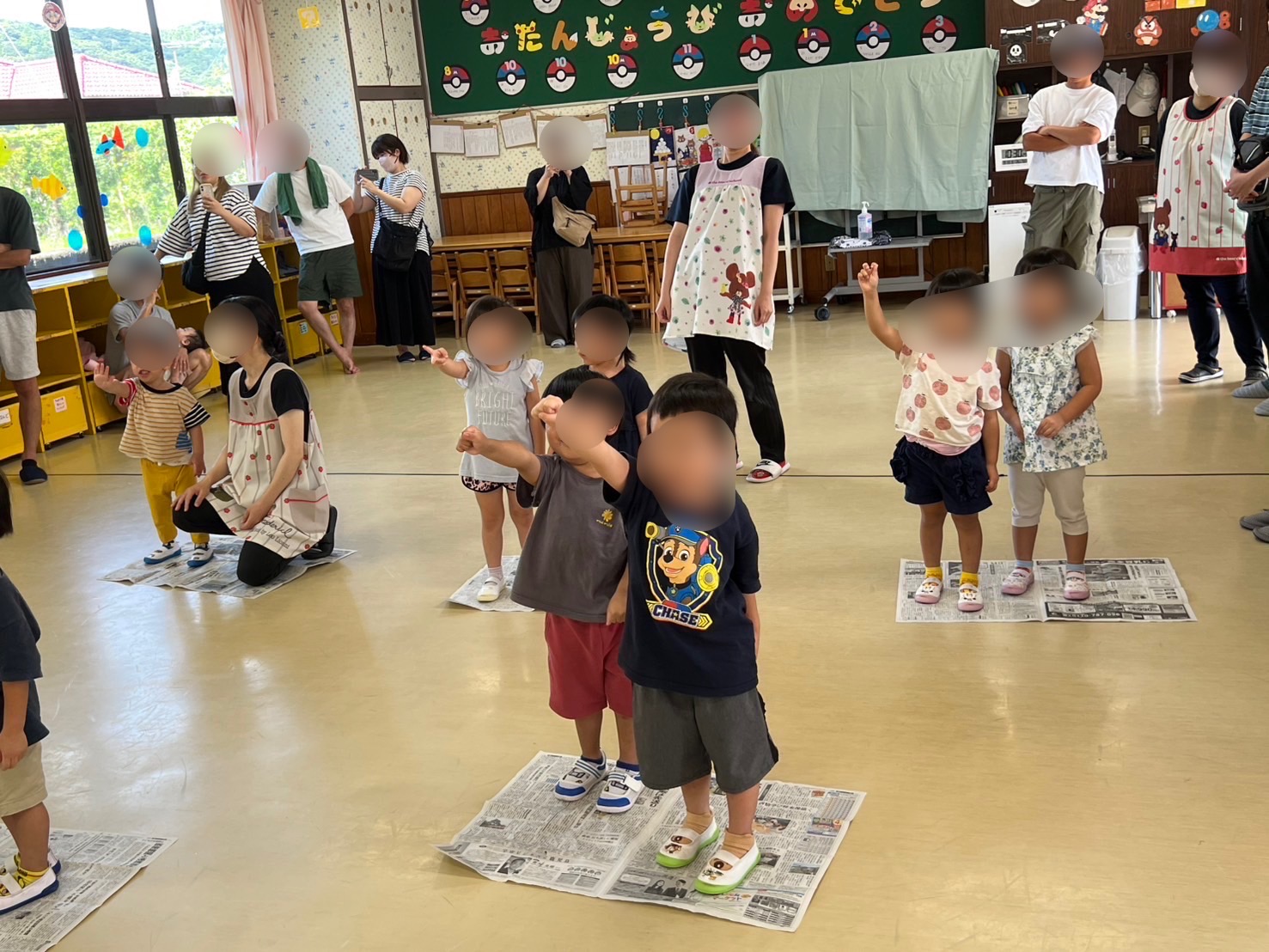 お母さんお父さんと一緒にした新聞紙じゃんけん、親子で新聞紙から落ちないように抱っこしてもらったり、ぎゅーっとくっついたり、子どもたちもとても嬉しそうでした🎶