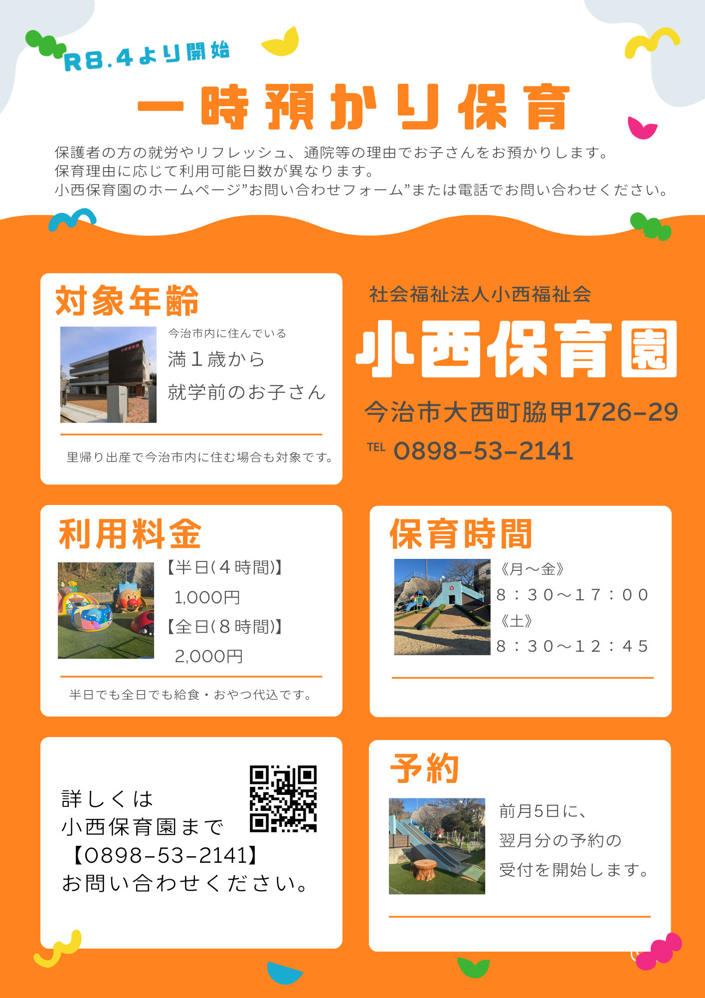 R8年4月より、一時預かり保育を開始します。利用を希望される方は、小西保育園までお問い合わせください。